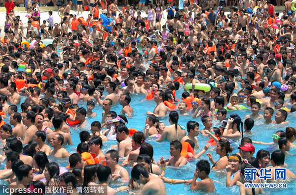 2013年6月16日,重庆加勒比海水世界,爸爸带着孩子戏水纳凉。当日,重庆发布高温橙色预警,室外温度突40℃,迎来14年来最热父亲节,父亲们带着孩子纳凉。