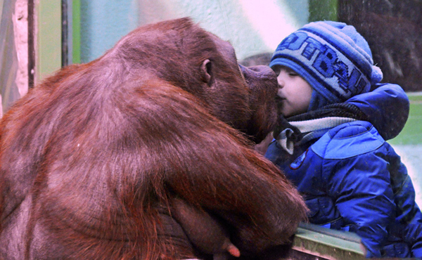 当地时间2011年11月8日,俄罗斯莫斯科,莫斯科动物园的一头大猩猩看到小男孩把脸贴到玻璃窗上,竟然也学着他的样子把脸贴上去,想要回他一个香吻。