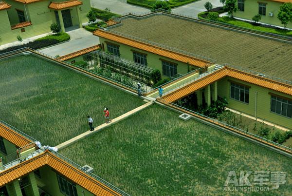 2013年7月30日,广西柳州市柳江县一家企业的楼顶稻田。在广西柳州市柳江县穿山食品工业园的一家酒类生产企业,工作人员在生产车间楼顶种上了今年的第二季水稻。楼顶插秧的难得景象,吸引不少市民前来参观。