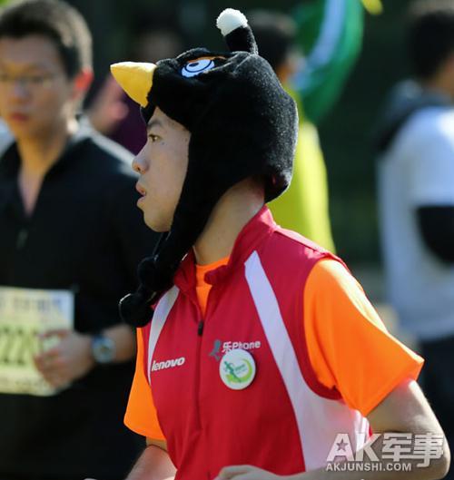 图为头戴“愤怒的小鸟”帽子的跑友。