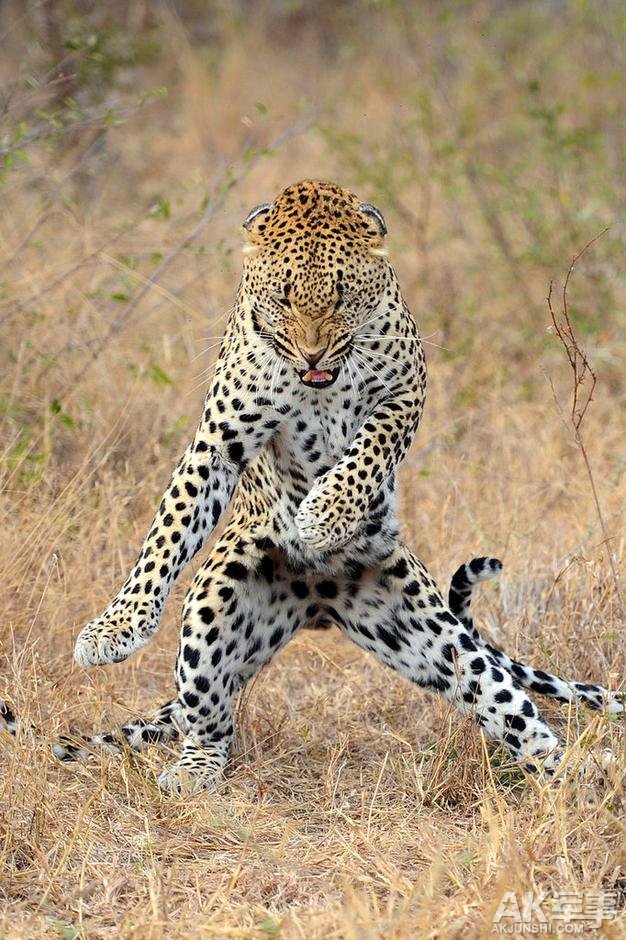 摄影师Mohammed Alnaser抓拍到这一有趣的一幕,一只花豹为了吸引雌性的注意力,后退站立,晃动着前肢,很像最近风靡全球的“江南style”,这只花豹看起来很有明星范儿。 南非摄影师Sabi Sands抓拍到一直花豹,为了追“女友”挑起了舞蹈,舞姿很像风靡全球的江南style。