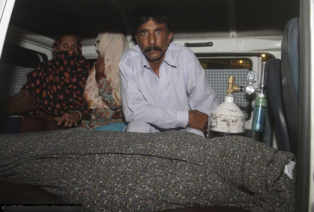 女子的丈夫Mohammad Iqbal,守着她的尸体坐在救护车里。