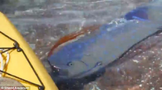 芝加哥谢德水族馆(Shedd Aquarium)组织专家旅游,他们在墨西哥柯蒂斯海(Cortés)清澈海水中发现一条活体皇带鱼,其体长约4.5米,背鳍几乎与身体同样长。