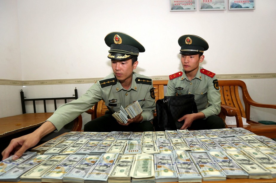 4月23日,广东边防六支队官兵在清点违规携带的美元现钞。