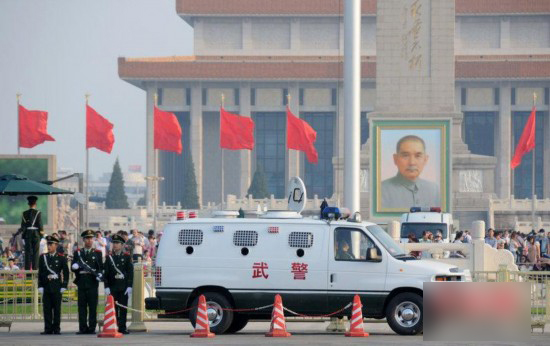 4月30日,北京,武警、民警在天安门广场及周边加强巡逻执勤,确保游客欢乐祥和地度过“五一”国际劳动节。