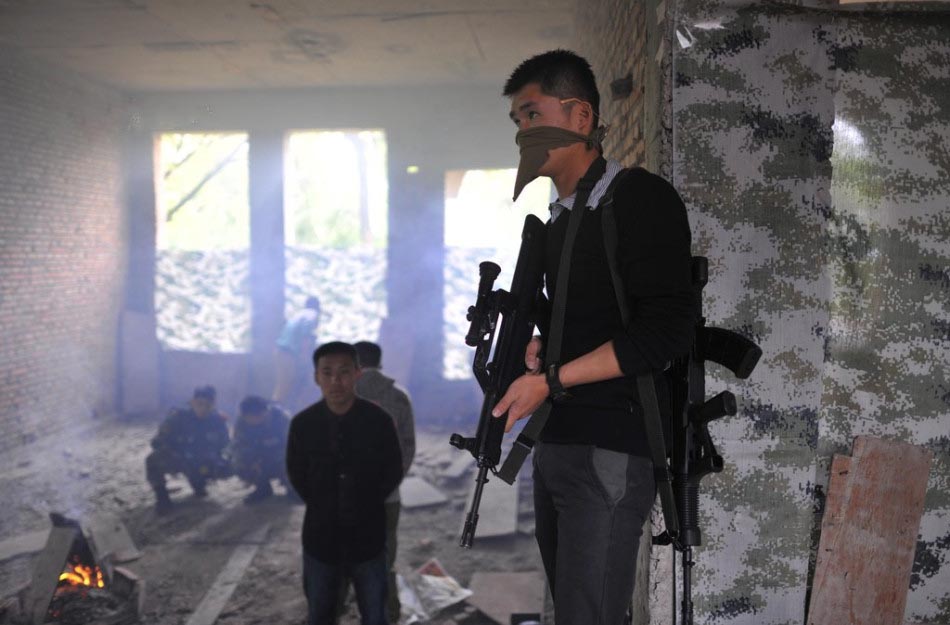 武警北京市总队迅速临时调遣分布在市区的4个防暴小分队,分赴事发地。 按作战部署,4组分别为十多人一组的防暴小分队依次进入事发地,在规定的时间内,侦查完敌情,提出处置方案。图为“恐怖分子”在建筑内携枪看押“人质”。