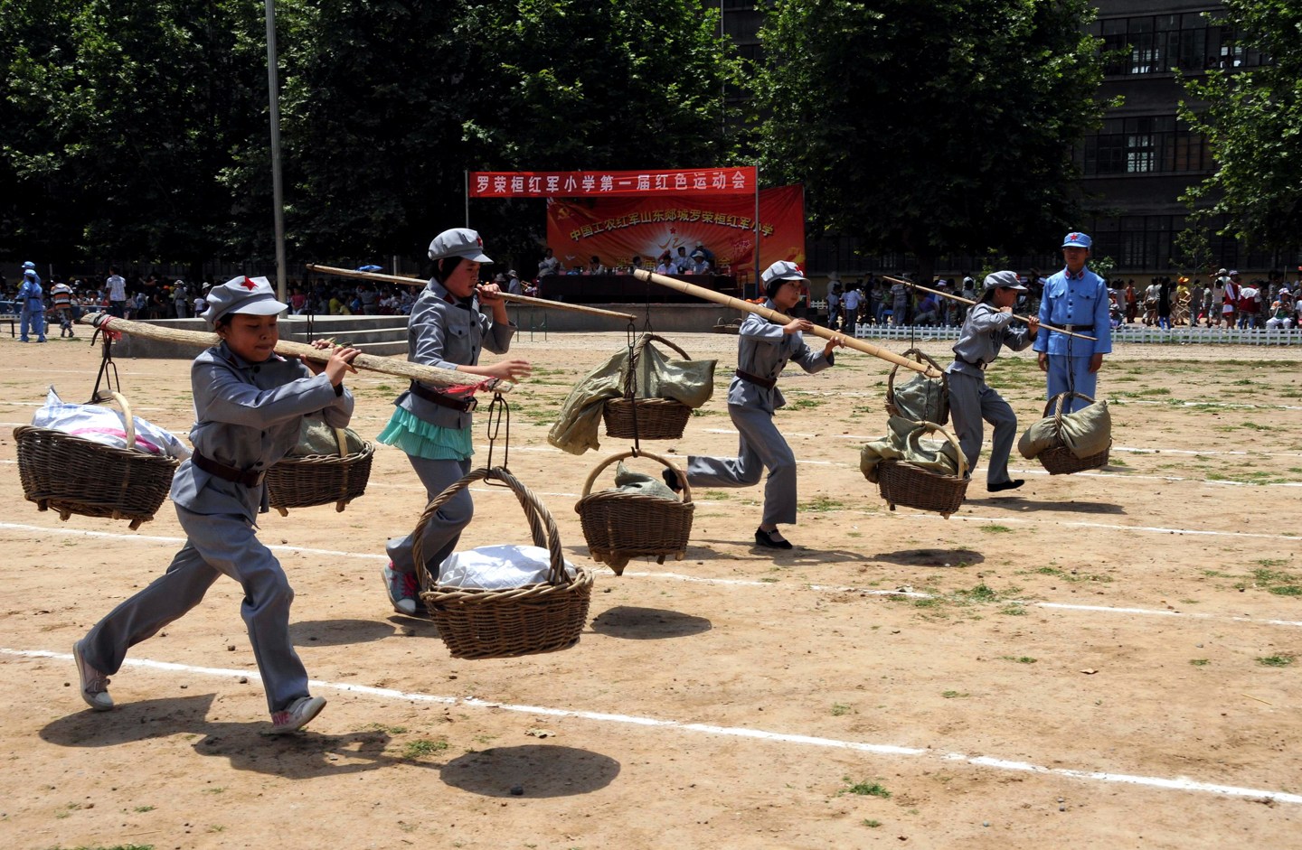 山东临沂,为庆祝六一儿童节的到来,临沂罗荣桓红军小学举办了首届“红色运动会”,将“扁担支前”“抬担架救伤员”“独轮车支前送军粮”等沂蒙人民拥军支前的故事融入体育竞赛之中,孩子身穿军服参加比赛。