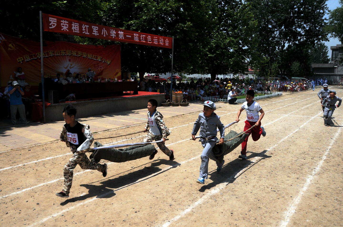 山东临沂,为庆祝六一儿童节的到来,临沂罗荣桓红军小学举办了首届“红色运动会”,将“扁担支前”“抬担架救伤员”“独轮车支前送军粮”等沂蒙人民拥军支前的故事融入体育竞赛之中,孩子身穿军服参加比赛。