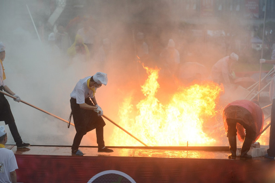 4月26日,世界第一锅炒辣椒炒肉在长沙开炒,现场面积为100平方米、重11吨的平底锅上放满了辣椒与猪肉。据主办方介绍,本次辣椒炒肉光食材的重量近3吨,炒肉的最长铲子达6米多……
