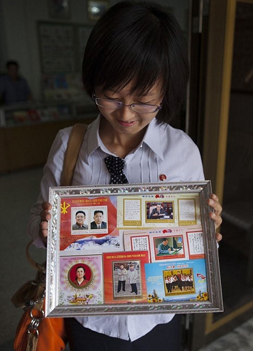 报道提到,朝鲜约会的情景很保守,女孩也不愿意首次见面就跟男孩跳舞。金小姐说,未婚先孕是绝不会发生的,问及是否有人得艾滋病,她说:“我们朝鲜没有艾滋病,一例都没有。”图为金小姐自豪地向Lafforgue展示她收集的印有朝鲜领导人的邮票。