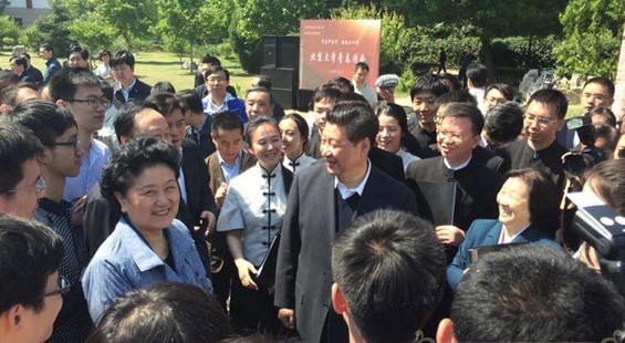 2014年5月4日,北京大学静园草坪,北大学生拍到的习大大(学生供图)。据法制晚报报道,当天上午10时15分,国家主席习近平来到北京大学静园草坪,同学们朗诵了《沁园春·长沙》这首诗歌。来自北大元培学院的姜江说,很多同学纷纷围上前,主动跟习主席握手的同学还激动地说,“我跟习主席握手啦!”学生供图