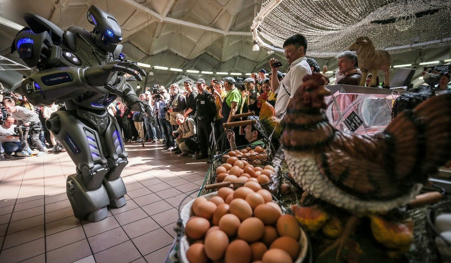 当地时间2014年5月12日,俄罗斯莫斯科市中心一处市场内,英国Cyberstein公司制作机器人“泰坦”亮相并与市场内的俄罗斯大妈大叔们互动。“泰坦”将于5月15日在俄参加机器人展会。