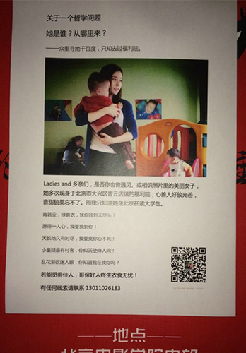 上周末,北京各大高校突然铺天盖地出现大量寻人启事招贴,告示称有人愿重金寻找一位在福利院偶遇的女学生,随即引发广泛关注。而后该女子已被搜索出是北京电影学院大四鲍姓学生。据了解,寻人者为某影视公司老板,因为一次爱心活动而偶遇此女生,寻人动机不明。此外,首位提供准确线索者已获赠包括住房、轿车和一笔创业基金在内的近千万丰厚报酬,着实让人惊讶。