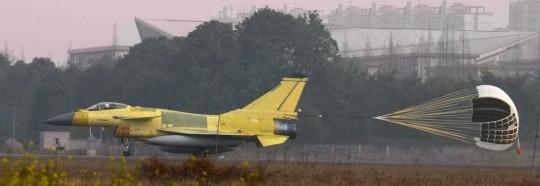 网友拍摄到的量产型歼-10B战斗机完成试飞降落时打开减速伞
