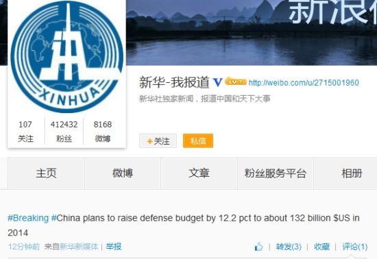 新华社3月5日报道,中国计划将2014年国防预算提高12%,达到1320亿美元(以实时汇率计算,约合人民币8109亿人民币)。另注:2013年军费预算为7202亿人民币。