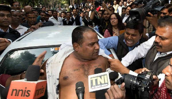 当地时间2014年3月4日,印度新德里,印度撒哈拉集团董事长苏布纳塔·罗伊抵达最高法院大楼,遭示威泼墨抗议。据悉,苏布纳塔·罗伊此前因拖欠巨款而遭最高法院传唤...
