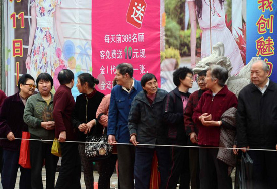 4月24日,在江西九江市一家服装、特产展销会现场,老人们正在排队等待领取10元代金券。自4月11日以来,河北的商家在江西九江举办服装、特产展销会,为提高人气,商家推出给前388名的顾客免费送10元现金代金券活动。许多老人每天早上4、5点钟就赶到展销会现场排队,为防止插队现象,商家给排队的顾客在手心上进行编号,但是依然有个别不自觉的老年顾客企图浑水摸鱼,被发现后与工作人员进行谩骂、扭打。