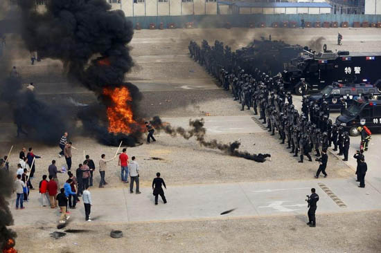 2014年4月25日上午9点,北京举行群体性事件演练。近百名手持棍棒的“违法聚集群众”出现在现在房山区长阳镇首创奥特莱斯附近,他们手持木棍,高声呼喊着口号。随着情绪越来越激动,一些聚集群众还出现了打砸车辆等情况,甚至不少人点燃了现场的可燃物和废旧轮胎。